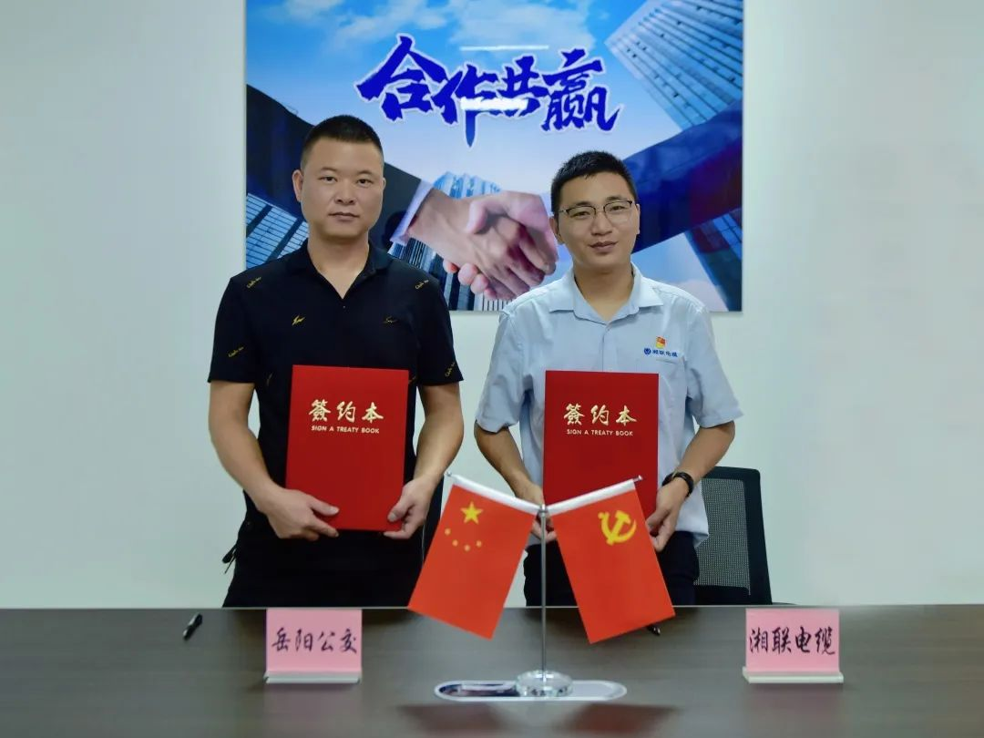 ▲湘聯(lián)電纜品牌總監(jiān)楊潔和岳陽市公共交通集團李彪副書記代表雙方簽署合作協(xié)議