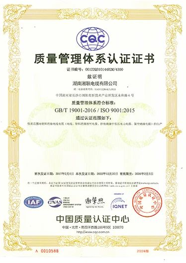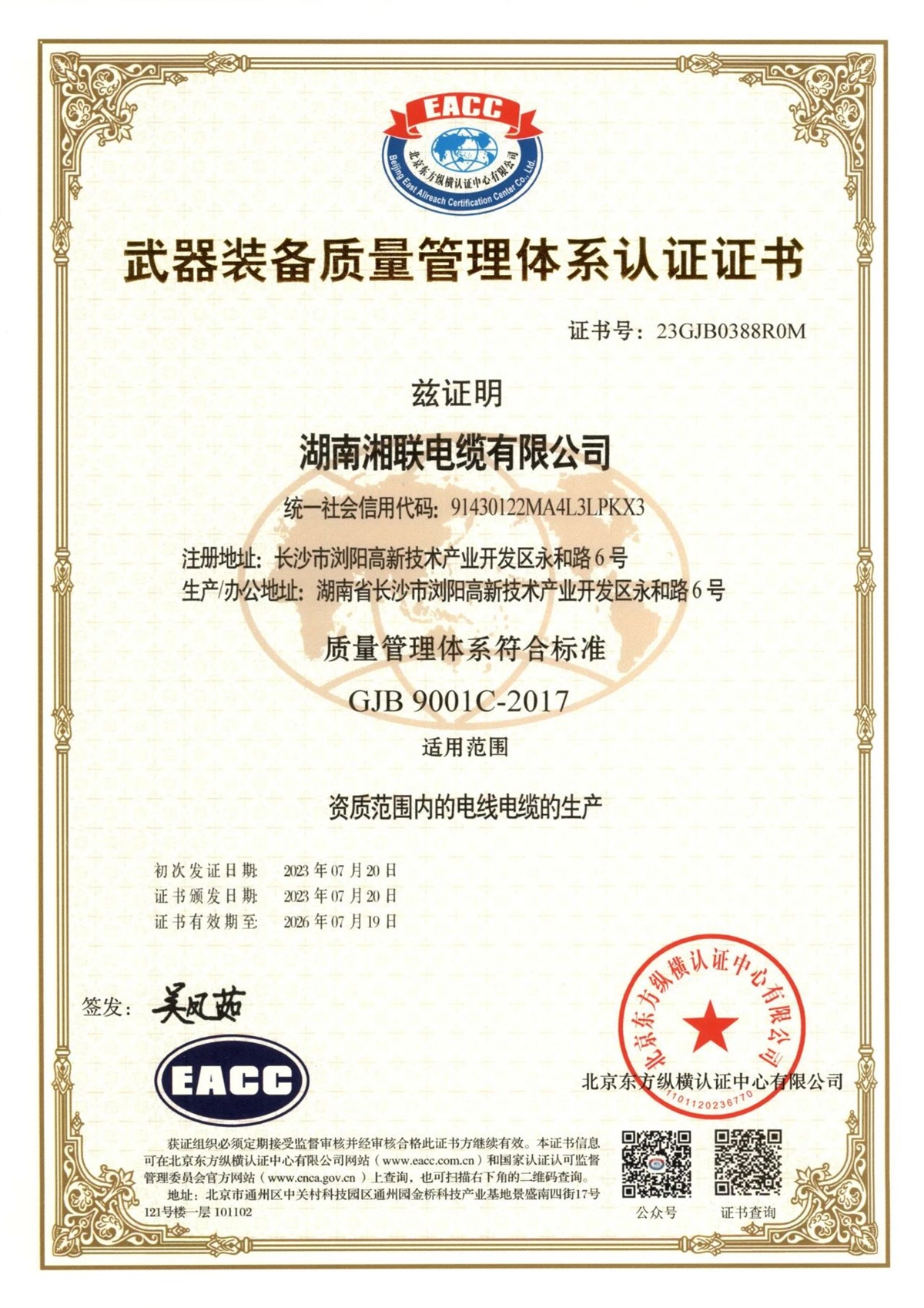近年來(lái),湘聯(lián)電纜始終以“質(zhì)量是發(fā)展的基石,是客戶信任的唯一理由”的質(zhì)量方針為導(dǎo)向,逐步建立了高標(biāo)準(zhǔn)質(zhì)量管理體系。從采購(gòu)、生產(chǎn)、檢測(cè)等方面實(shí)施全方位質(zhì)量把控,落實(shí)各方面質(zhì)量責(zé)任,實(shí)現(xiàn)全過(guò)程質(zhì)量追溯。做到最大限度消除質(zhì)量隱患,產(chǎn)品質(zhì)量和客戶滿意度不斷提升。公司先后通過(guò)國(guó)家強(qiáng)制性產(chǎn)品認(rèn)證(CCC認(rèn)證)、全國(guó)工業(yè)生產(chǎn)許可證、“三位一體”管理體系、武器裝備質(zhì)量管理體系認(rèn)證,獲評(píng)專(zhuān)精特新小巨人企業(yè)、企業(yè)標(biāo)準(zhǔn)“領(lǐng)跑者”等榮譽(yù),得到業(yè)界廣泛認(rèn)可和贊譽(yù)。
