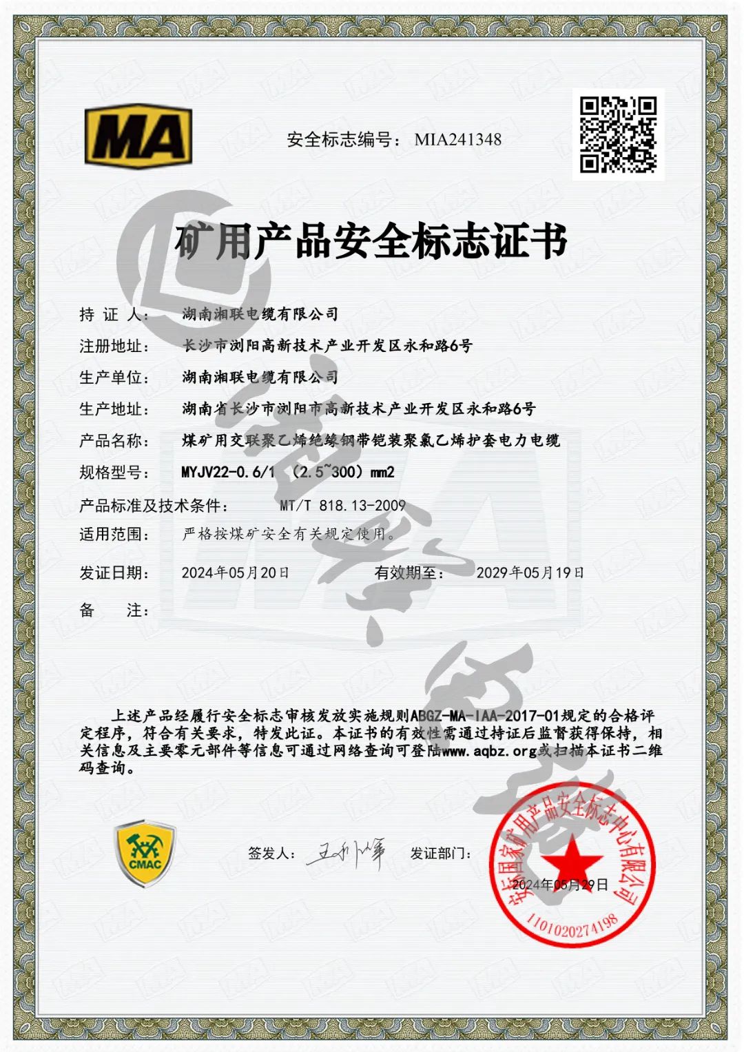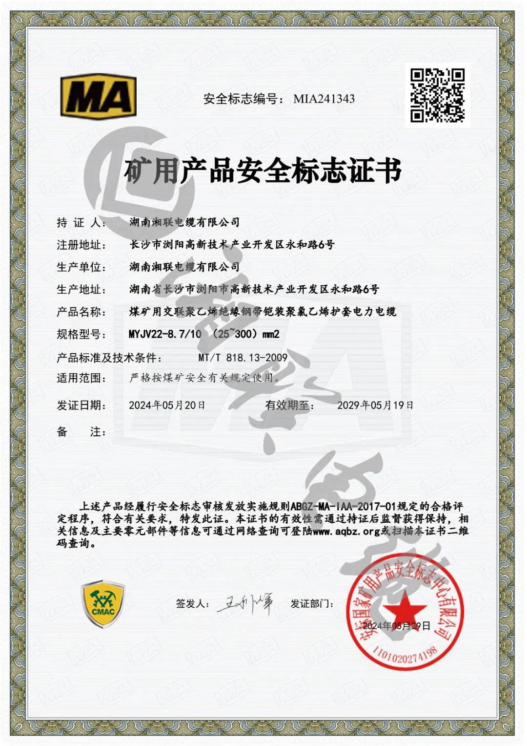 此次獲批礦用產(chǎn)品安全標(biāo)志證書是對湘聯(lián)電纜產(chǎn)品品質(zhì)和企業(yè)綜合實力的最佳認證之一。自成立以來,湘聯(lián)電纜始終堅持嚴(yán)把產(chǎn)品質(zhì)量關(guān),持續(xù)優(yōu)化科技創(chuàng)新體系,公司產(chǎn)品已廣泛應(yīng)用于電力、石化、建筑、交通等多個行業(yè),企業(yè)先后通過國家強制性產(chǎn)品認證、“三位一體”管理體系認證、武器裝備質(zhì)量管理體系認證等國家和行業(yè)的專業(yè)認可,獲得用戶廣泛贊譽。未來,湘聯(lián)電纜將繼續(xù)加強科技創(chuàng)新力度,不斷提升產(chǎn)品核心競爭力,持續(xù)以安全優(yōu)質(zhì)的產(chǎn)品服務(wù)市場,為公司高質(zhì)量發(fā)展注入新動能。