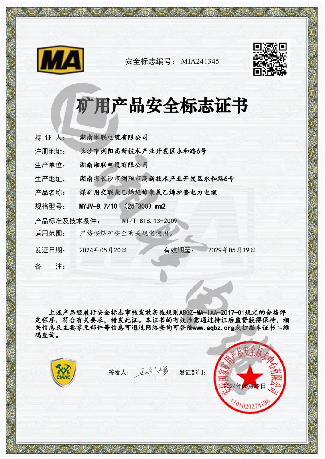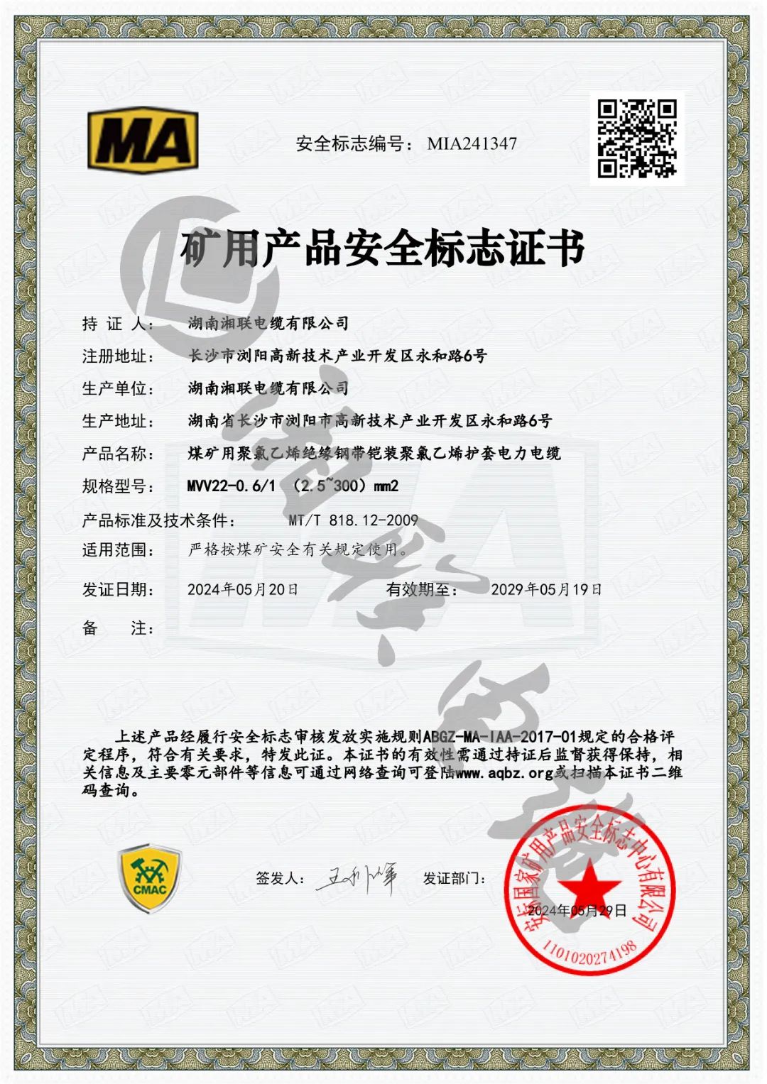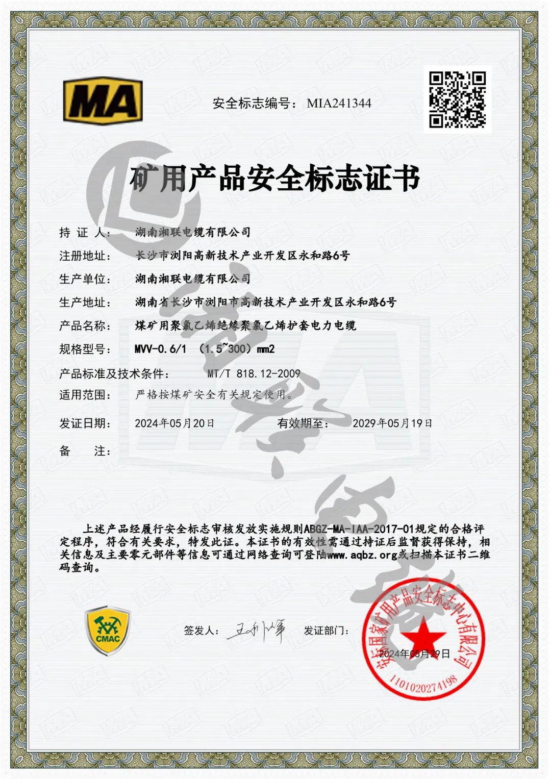 近日,湖南湘聯(lián)電纜有限公司成功取得安標(biāo)國家礦用產(chǎn)品安全標(biāo)志中心頒發(fā)MVV-0.6/1(1.5~300)mm2煤礦用聚氯乙烯絕緣聚氯乙烯護套電力電纜、MYJV-8.7/10(25~300)mm2煤礦用交聯(lián)聚乙烯絕緣聚氯乙烯護套電力電纜等六個產(chǎn)品的礦用產(chǎn)品安全標(biāo)志證書。