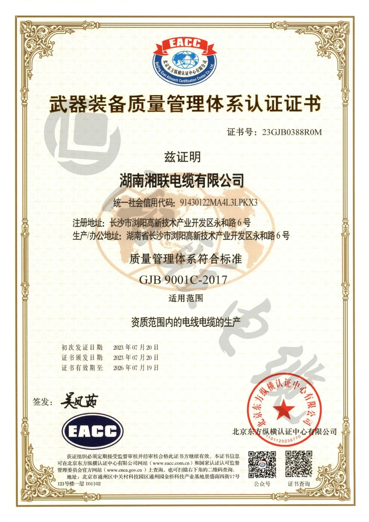 2023年,湘聯(lián)電纜順利通過國軍標(biāo)質(zhì)量管理體系認(rèn)證,獲得《武器裝備質(zhì)量管理體系認(rèn)證證書》,質(zhì)量管理體系符合:GJB9001C-2017標(biāo)準(zhǔn),這表明湘聯(lián)電纜的質(zhì)量管理體系符合武器裝備質(zhì)量管理體系的標(biāo)準(zhǔn)及相關(guān)要求,具備軍品研發(fā)、生產(chǎn)和服務(wù)的質(zhì)量管理能力。